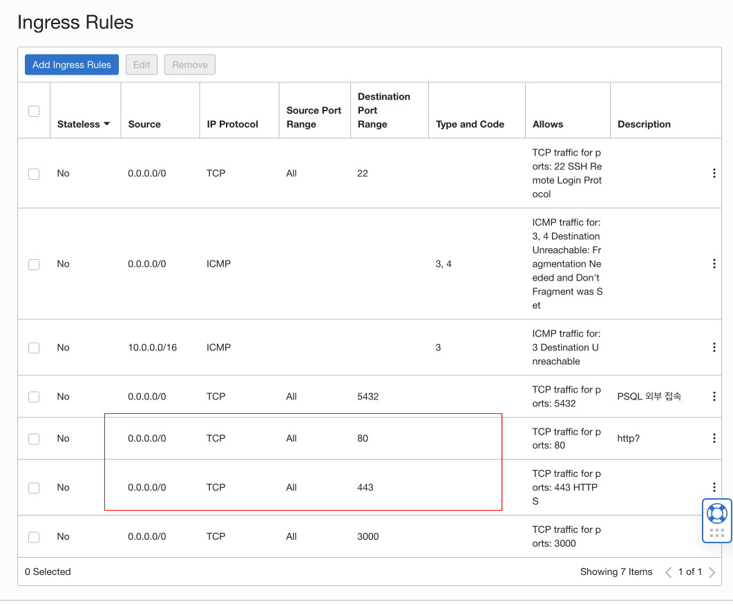 아마존 AWS EC2 에서는 보통 이것이 inbound rules 라고 되어있는 부분. 포트를 80(http), 443(https) 를 열어줌으로써 해결을 하곤 했다. 오라클의 경우 이 부분이 Ingress Rules 라는 단어를 사용한다. 다음 사진들은 그 Ingress Rules 를 수정하는 스크린샷이다.