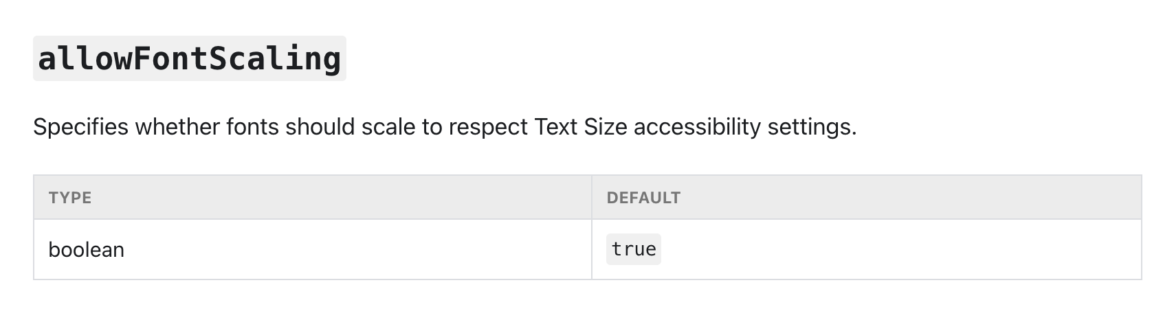 앱을 개발하다보니 안드로이드 기기에 따라 디자인에 맞춰 제작한 폰트 크기가 이상하게 크게 나타나는 현상을 발견하였다. 스택오버플로우를 검색해본 결과 기본적으로 사용하는 <Text> 컴포넌트에 allowFontScaling 프로퍼티가 다음과 같이 default: true 로 되어있는 것을 알 수 있었다.